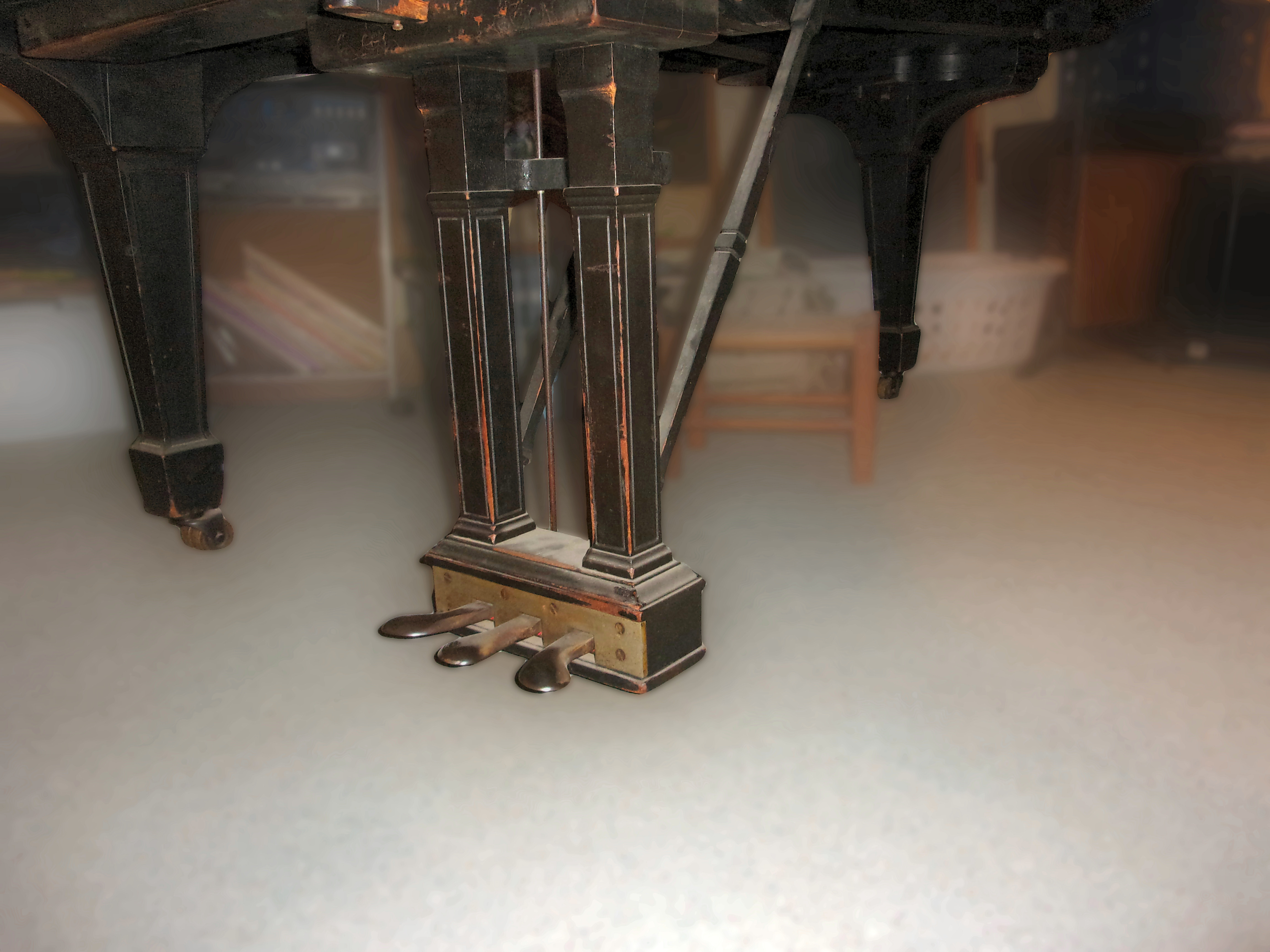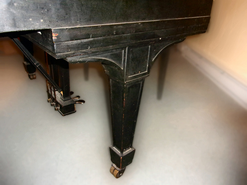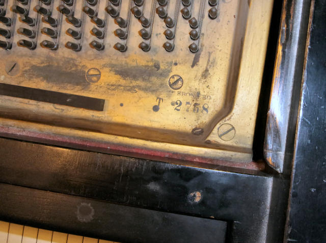 The piano is currently in general working order. This means that all parts of the lower and upper action, along with the trapworks are functioning. The tuning pins have good holding power, and the strings still produce good tone. This instrument could very well, in our opinion, be a good entry point for one who wishes access to a very high quality instrument and would plan to later have the instrument rebuild (to maximize its full playing capabilities).