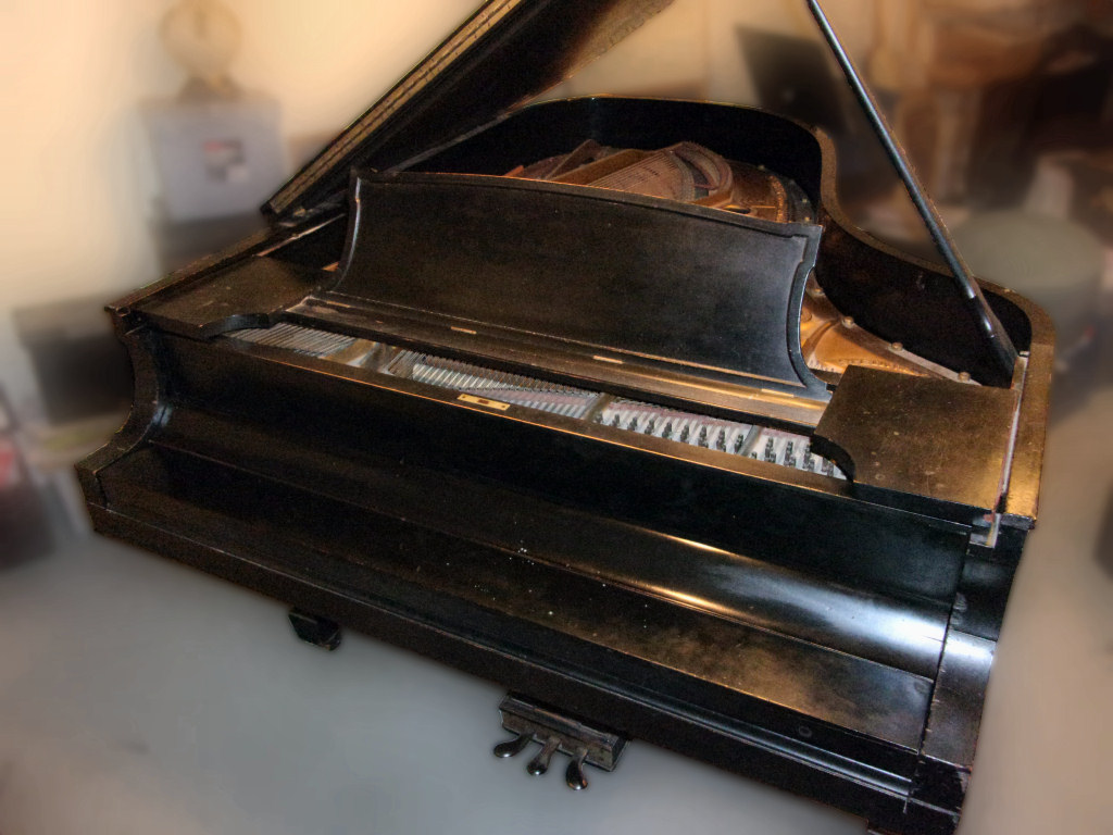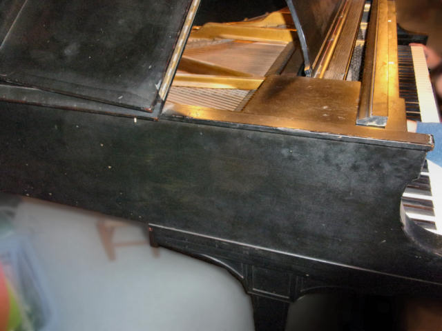 The piano has had much wear. The shellac finish is missing in some areas (mostly edges), along with discolored rings left by items that at one time had been set on the lid. The instrument (at minimal) should be thoroughly cleaned.